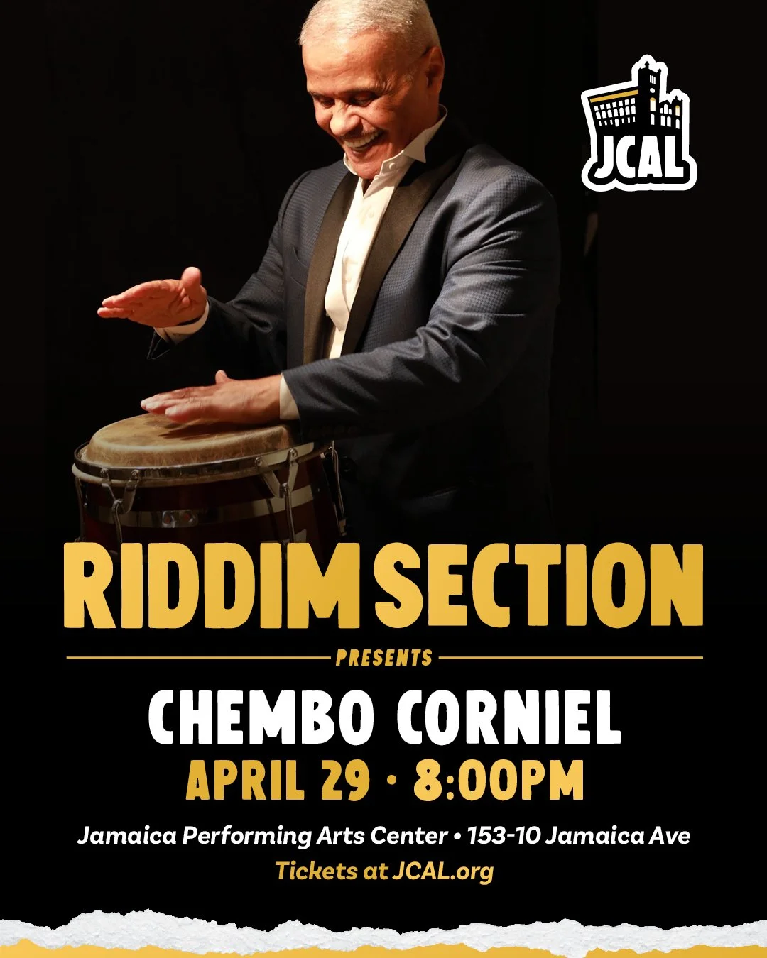 Join us for an exciting Riddim Section concert! On April 29, at 153-10 Jamaica Avenue, we're presenting the renowned percussionist Wilson “Chembo” Corniel.