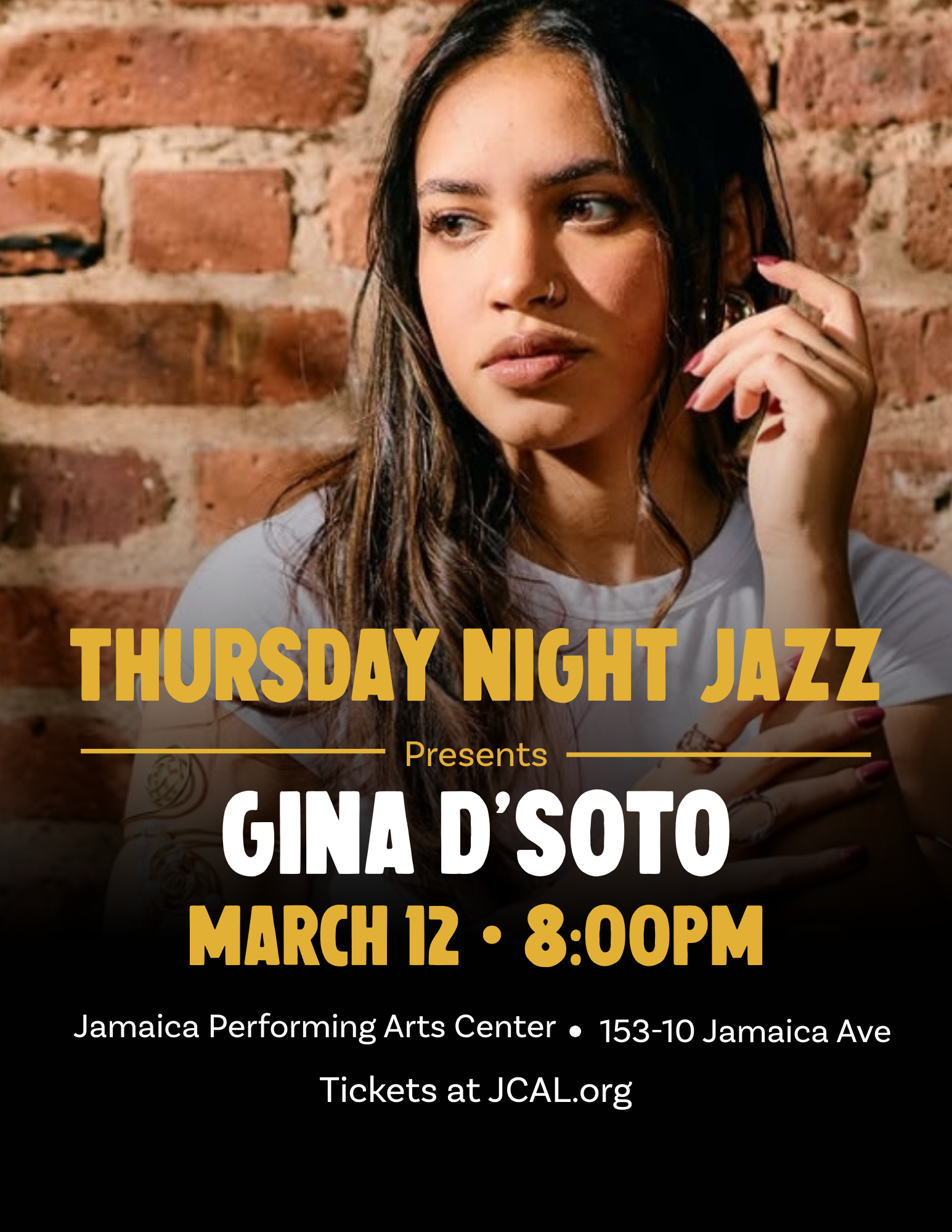 This installment of Thursday Night Jazz will feature a special pre-show by members of the Jazz Tide, an alumni band from Queens College. The Jazz Tide will open with a performance at 7pm, which will be followed by a concert headlined by Gina D'Soto at 8pm.