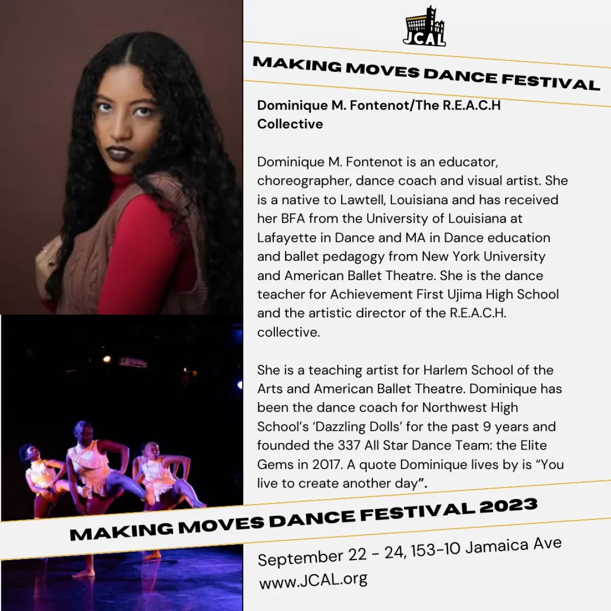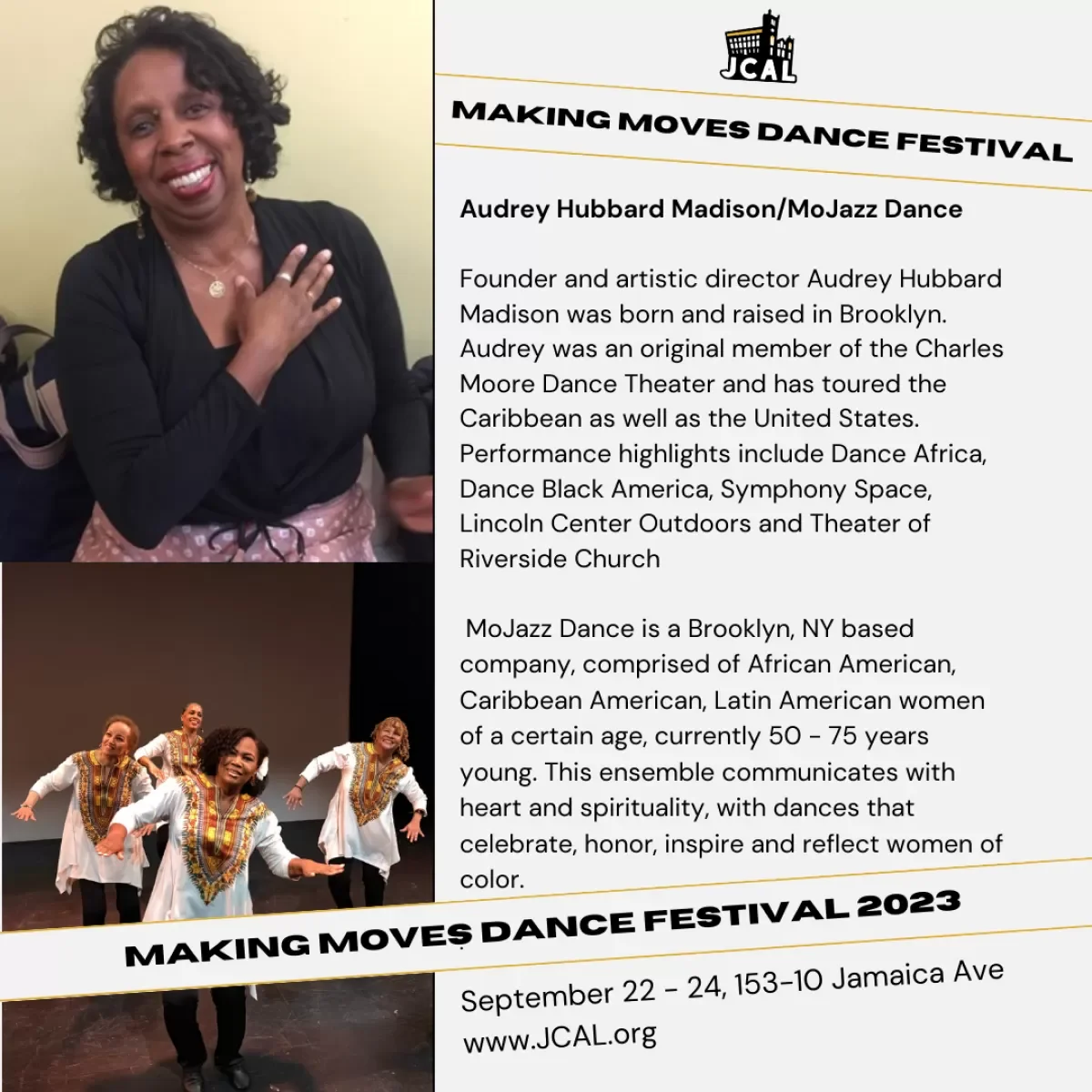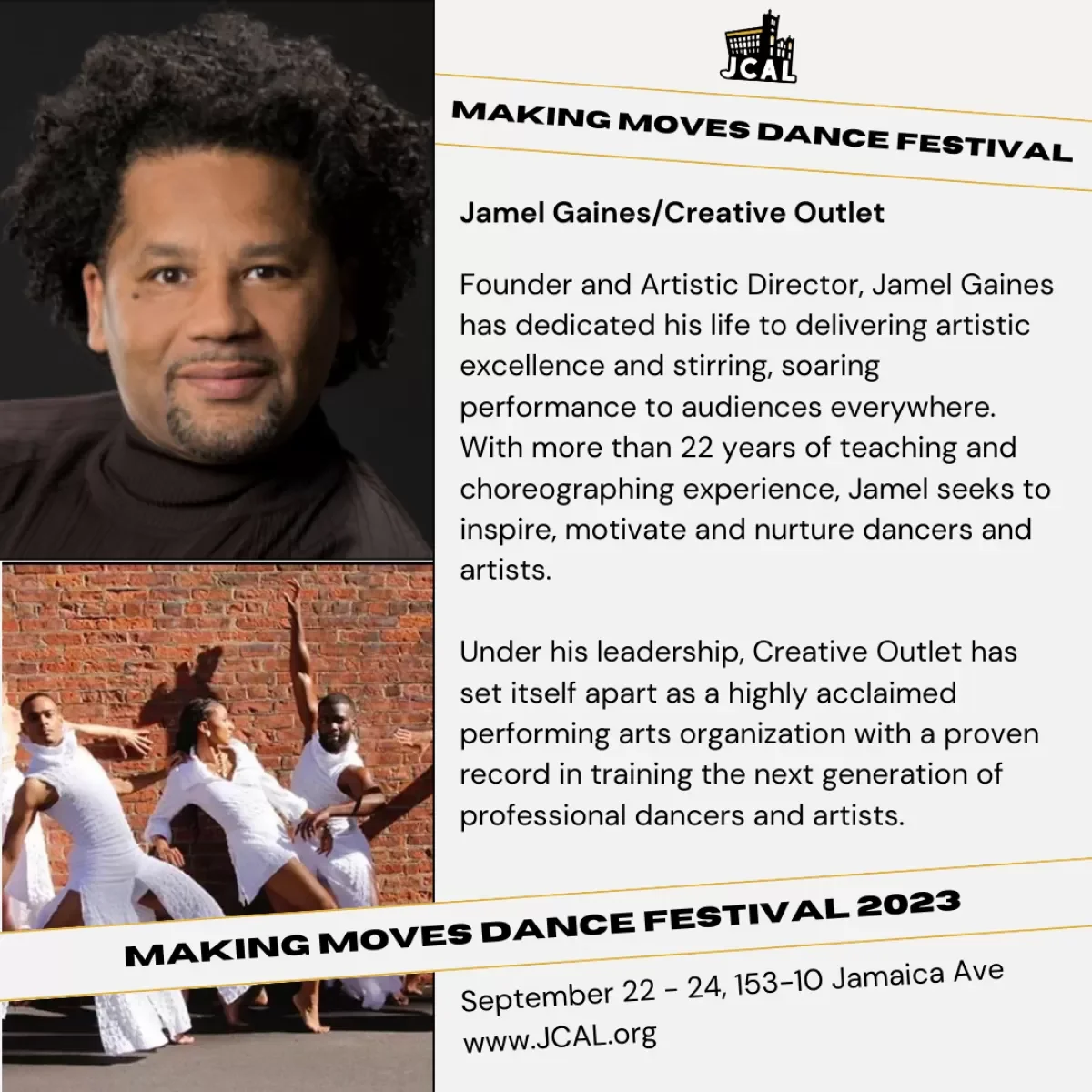 August 1, 2023 (New York) – Jamaica Center for Arts and Learning (JCAL) is pleased to present Making Moves Dance Festival 2023 - To Freedom! The three day event will kick off Friday, September 22nd and end Sunday, September 24th. On each evening, the festivities will begin at 7 pm inside of Jamaica Performing Art Center’s 400 seat theater at 153-10 Jamaica Avenue. Now in it’s 14th year, Making Moves Dance Festival (MMDF) has served as a platform to promote new, emerging, and underrepresented dance companies.